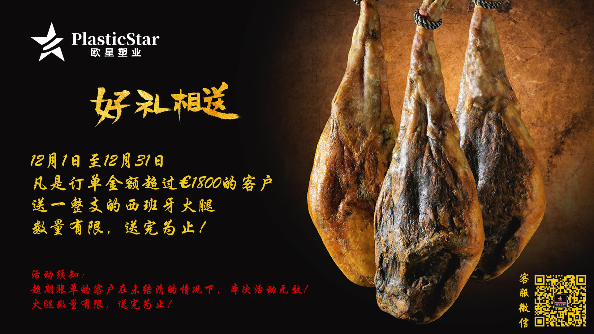 Promozione 12月活动 Promozione di dicembre 9 Luglio 2025 Posted by admin 30 Nov 12月1至12月31日,凡是友购订单金额超过€1800的客户,送一整只的西班牙火腿。数量有限,送完为止! 活动须知: 超期账单的客户未结清的情况下,本次活动无效!火腿数量有限,送完为止!